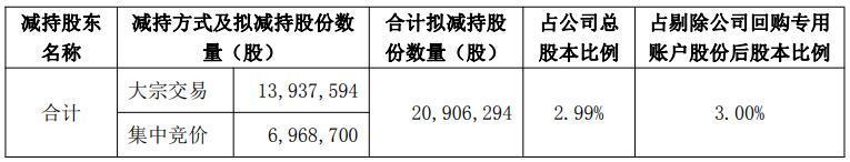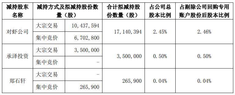 粤海饲料公告称,公司近日收到控股股东湛江市对虾饲料有限公司(以下简称“对虾公司”)、实际控制人(董事长兼总经理)郑石轩及其一致行动人承泽投资出具的《上市公司股东股份减持计划告知函》,以上股东计划自2026年1月15日至4月14日合计拟减持公司股份的总数不超过20,906,294股,即不超过剔除公司回购专用账户股份后股本的3.00%,其中大宗交易减持不超13,937,594股(即不超过剔除公司回购专用账户股份后股本的 2%),集中竞价减持不超6,968,700股(即不超过剔除公司回购专用账户股份后股本的1%)。