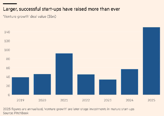 2025年融资热潮的另一个推动因素是,领先的人工智能集团的增长速度远远超过了过去的科技初创企业。